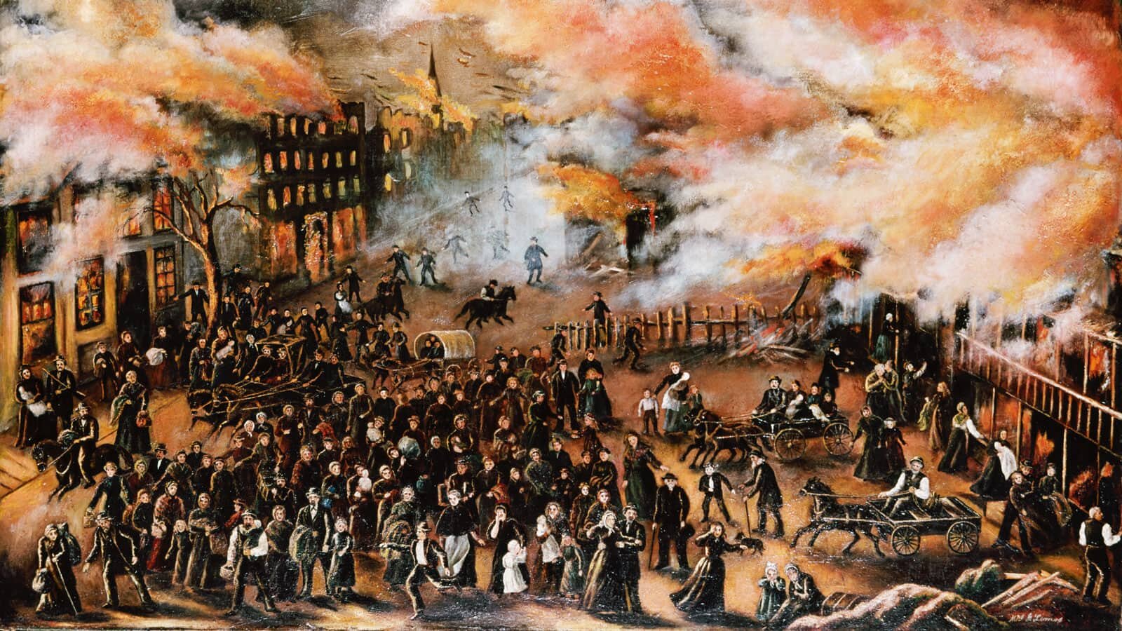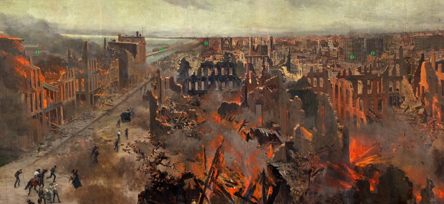 Immerse yourself in this extraordinary and historic 40-foot-wide oil painting that captures a 360° view of the Great Chicago Fire.